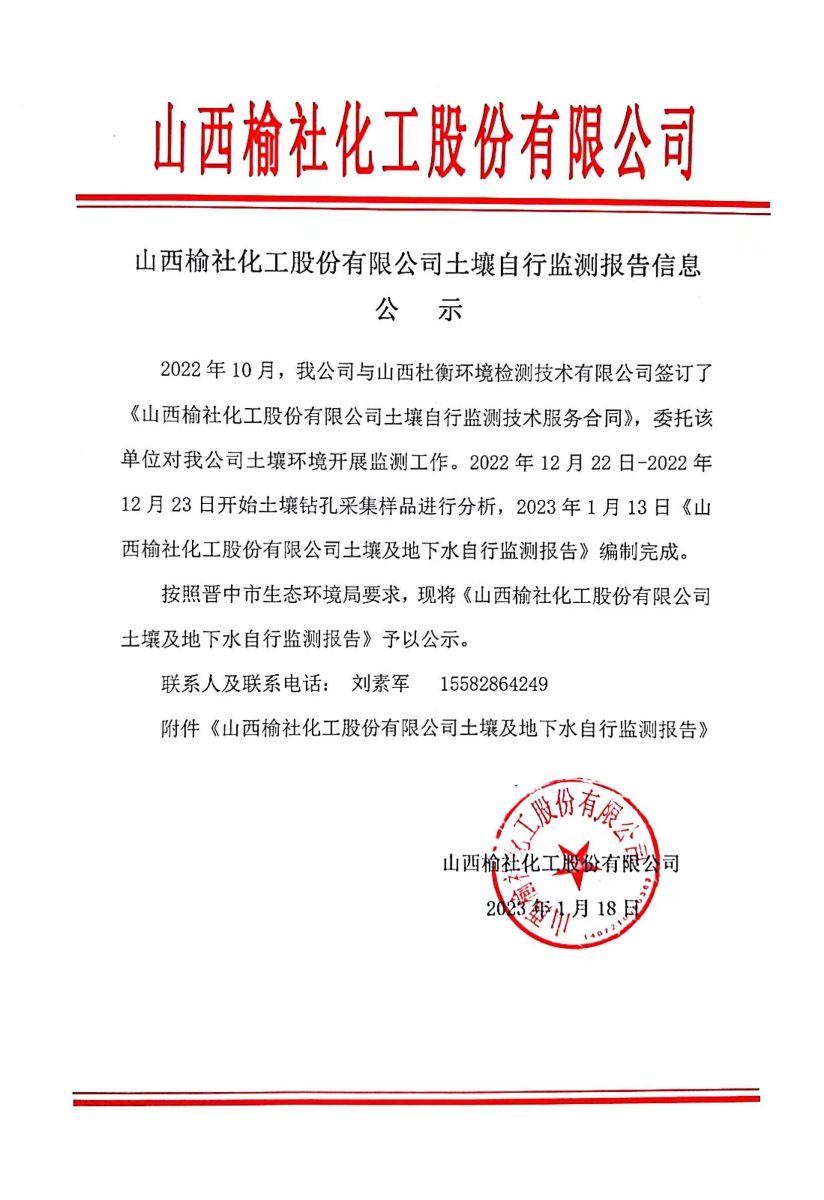 榆社化工土壤和地下水自行監(jiān)測2022年報告